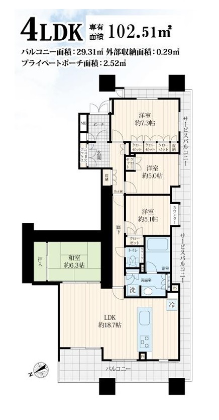 | バルコニー面積 | 29.31m² 北西向き | ||