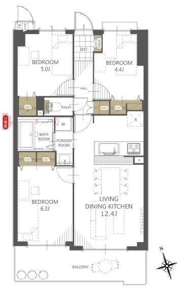 | 間取 | 3LDK + 洋6.3×1・洋5×1・洋4.4×1・LDK12.4×1 | ||